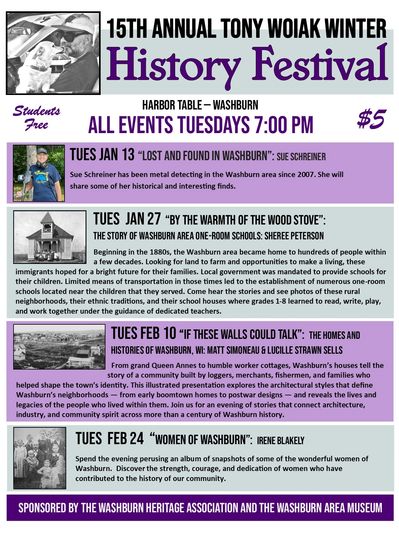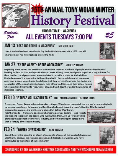 The purpose of the History Festival is to provide educational and entertaining programs about Washburn area history. Programs are scheduled four times in the winter and four times in the summer.